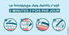 Le brossage des dents c’est 2 minutes, 2 fois par jour ! 1- Brosser la face supérieure des dents par un mouvement d’avant en arrière. 2- Incliner la brosse à 45° afin d’éliminer le maximum de plaque dentaire. 3- Effectuer un mouvement de rouleau de la gencive vers la dent pour bien nettoyer les faces internes et externes des dents. 4- Dents de devant : placer la brosse verticalement en allant toujours de la gencive vers la dent.